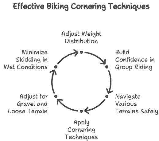 Cornering techniques help with weight distribution outside the pedal and increase traction on your tires. Riding in a group can help build confidence and speed proficiently during the turns. It is required to navigate various biking terrains with safety and prevent sweeping or energy loss on the trail.